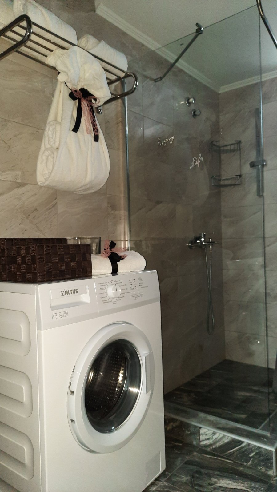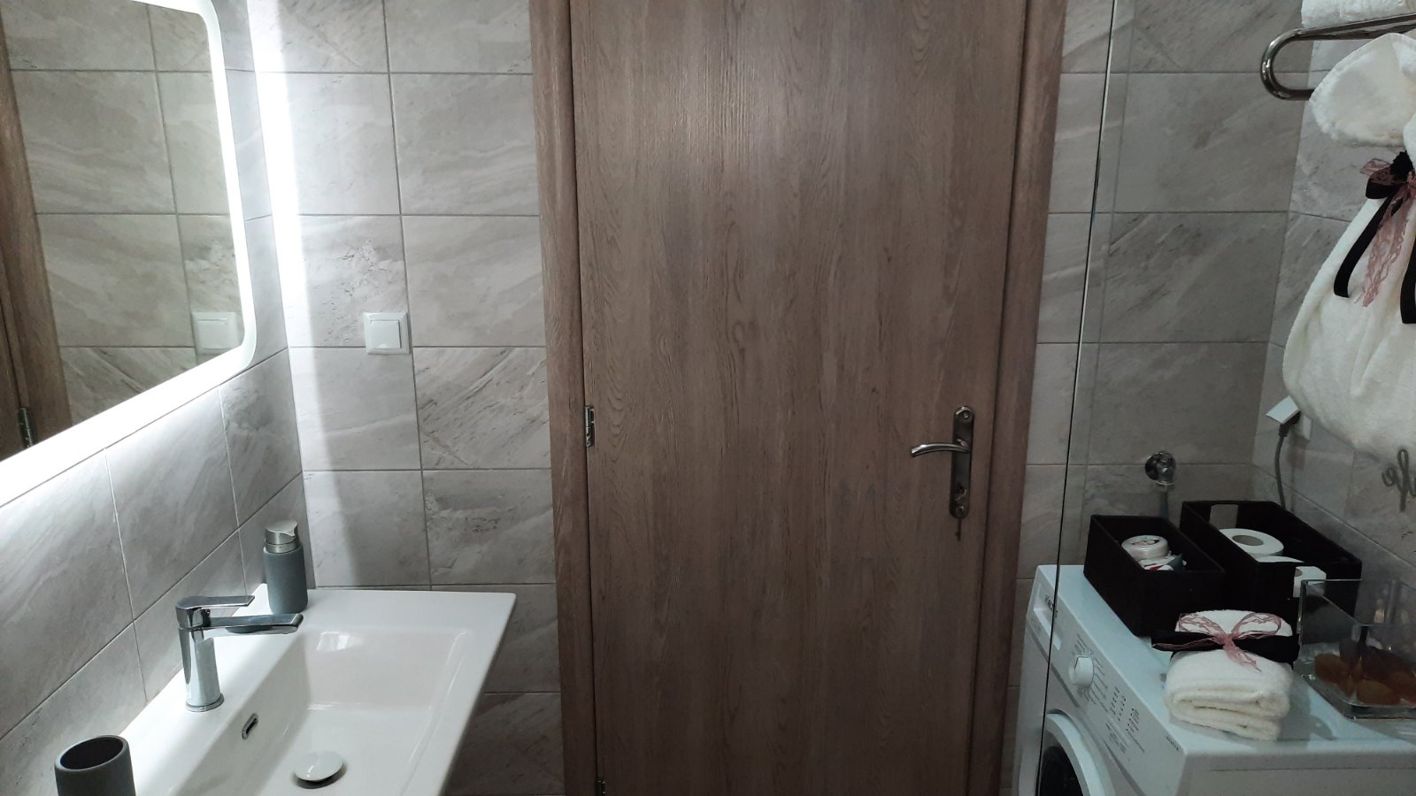 Equipped with with a shower, sink, toilet and washing machine. Clean towels and personal hygiene products are always available (toilet paper, liquid soap, soap, hair shampoo, shower gel)