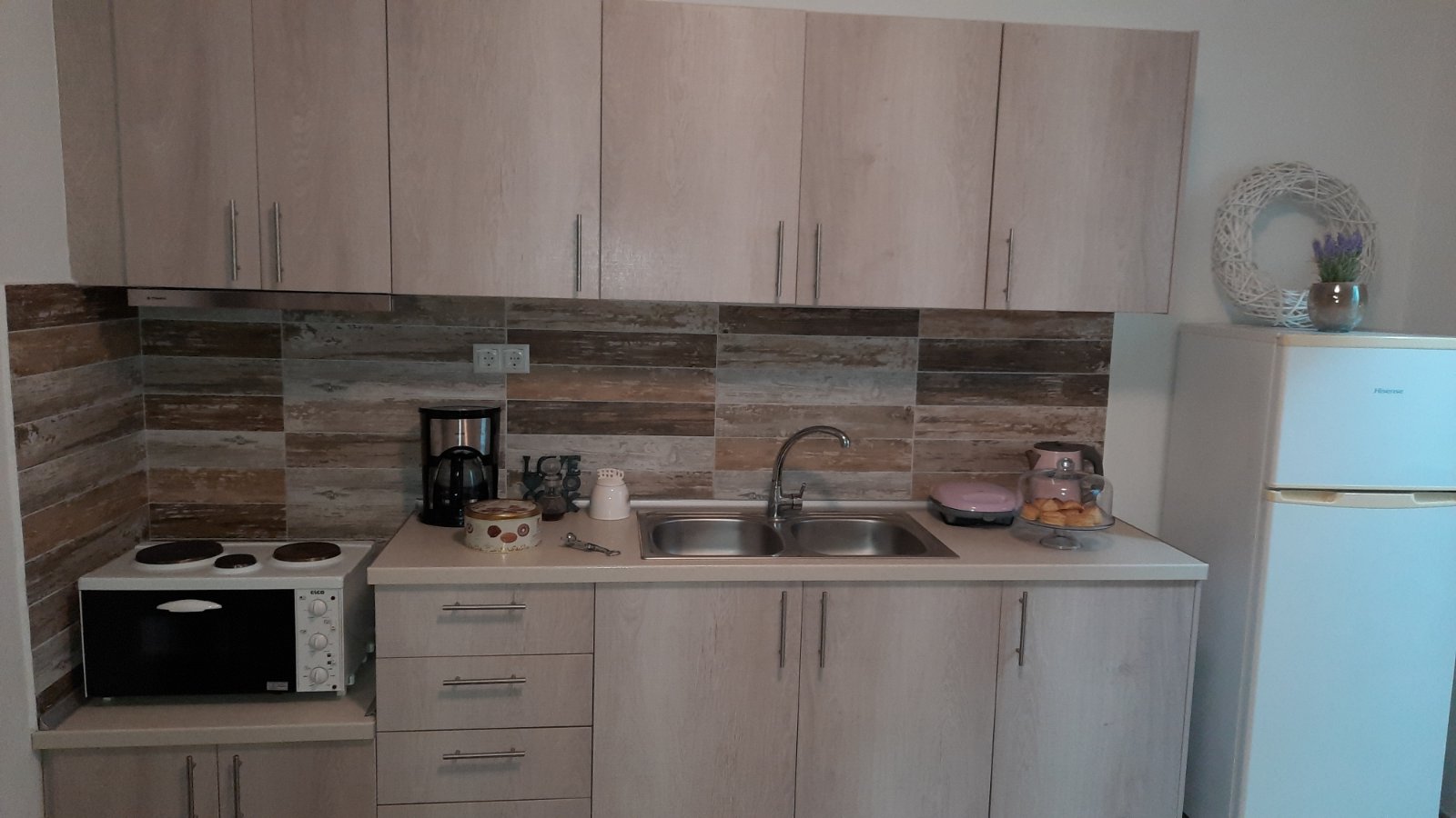 Fully equipped with with a large refrigerator and freezer chamber, a two-ring cooker and an oven, an aspirator. Dishes for preparing dishes and dining are enough for 12 people