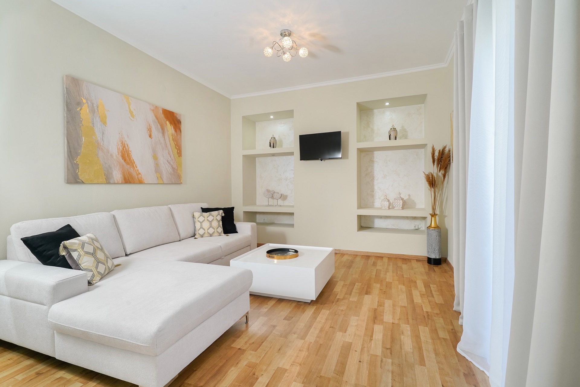 Εκτός από τα διπλά κρεβάτια, υπάρχει ένας πτυσσόμενος καναπές στο σαλόνι