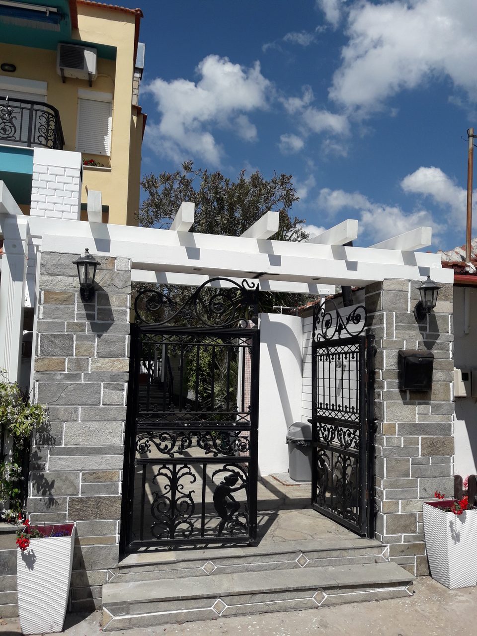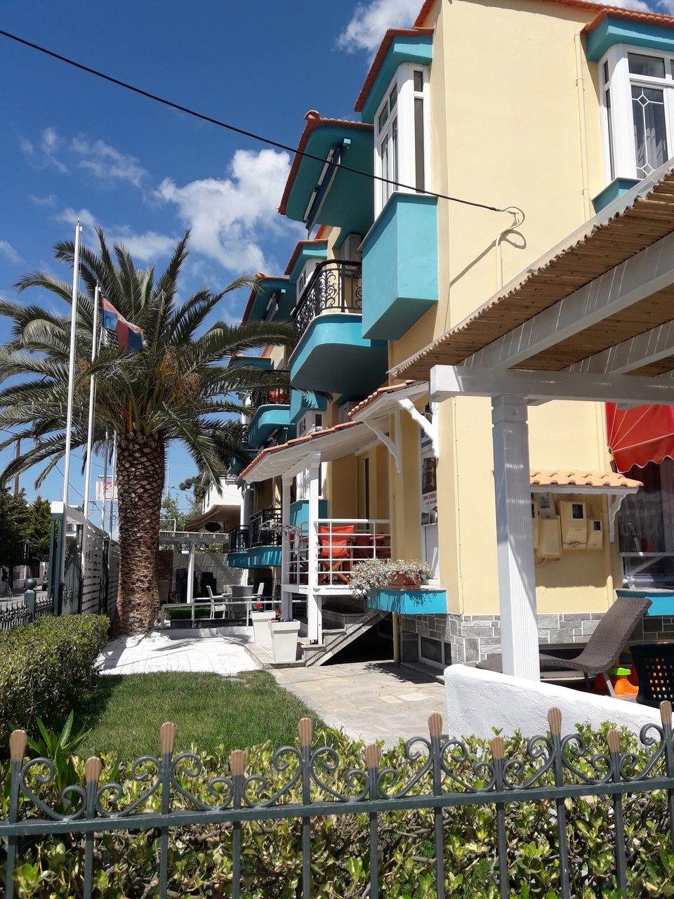 The house is located on the main road, only 50 m from the centre of Skala Sotiros and 20 metres from the main village beach. Pharmacy, shops, bars and bakeries are 15-50 m away. It is surrounded by a spacious courtyard with seating sets, and you are choosing whether to enjoy the shade of one of the pergolas or the natural shade of the palm tree. There is a barbecue in the courtyard that guests can use free of charge. The capacity of the house is 25 adults, and in some rental units there is the possibility of adding extra beds at a surcharge and baby cot for free. The units span at three levels. The lowered ground floor is a little entrenched relative to the level of the courtyard, which includes a reception area, two four-bed studios with a bathroom and a kitchen. These studiοs are suitable for people with disabilities who use wheelchairs. At this level there is also a bathroom with a washing machine available to all guests for their personal needs. On the ground floor is a four-bed apartment with a kitchen with a dining area, a bathroom, a balcony and two separate bedrooms. There are five studios on the first floor, two of them double and three three-bed studios. Each studio on the first floor has a balcony and sea views. Rooms and courtyard are equipped with TOTAL TV with more than 100 channels in Serbian (sports, children's programmes, music, movies, entertainment, info) and the selection of channels to follow depends on the wishes of the guests. All units are equipped with air conditioning, and Wi-Fi is available in all rooms and in the courtyard.